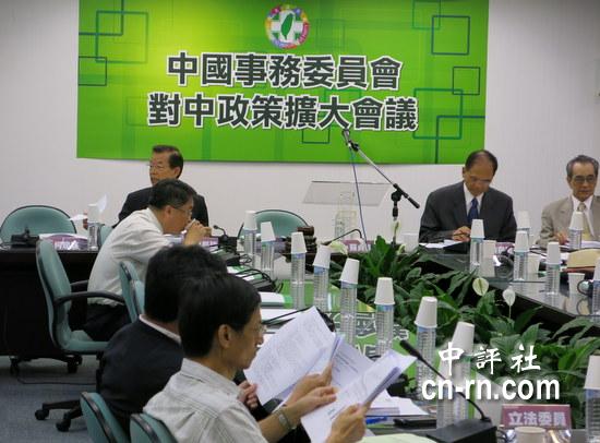 民进党今天举行“中国事务委员会对中政策扩大会议”,讨论主题为“台湾对中政策的核心价值与愿景”,由民进党主席苏贞昌亲自主持,四位引言人为:中山大学社会系副教授蔡宏政、“立委”管碧玲、林浊水、新北市党部主委罗致政。谢长廷、游锡堃、已经退党的沈富雄、前驻日代表许世楷、罗福全等人都出席。