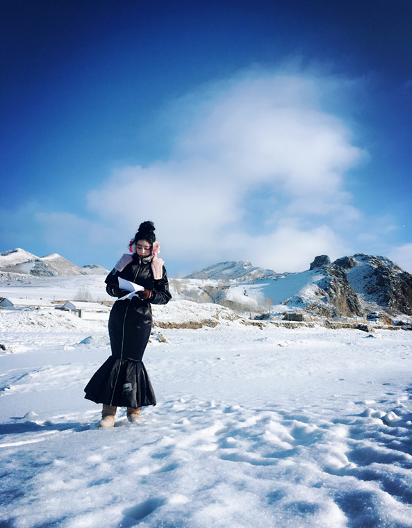张馨予戴皮草耳套抵抗严寒,驻足雪地。