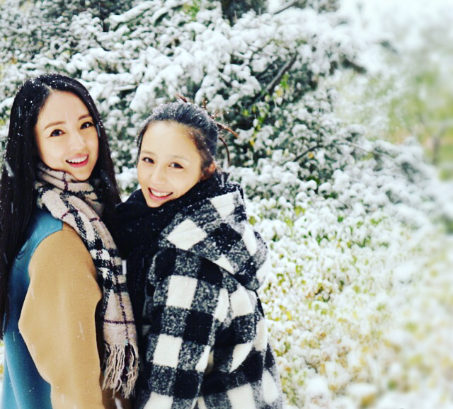 佟丽娅与董璇玩雪,二人似双胞胎。
