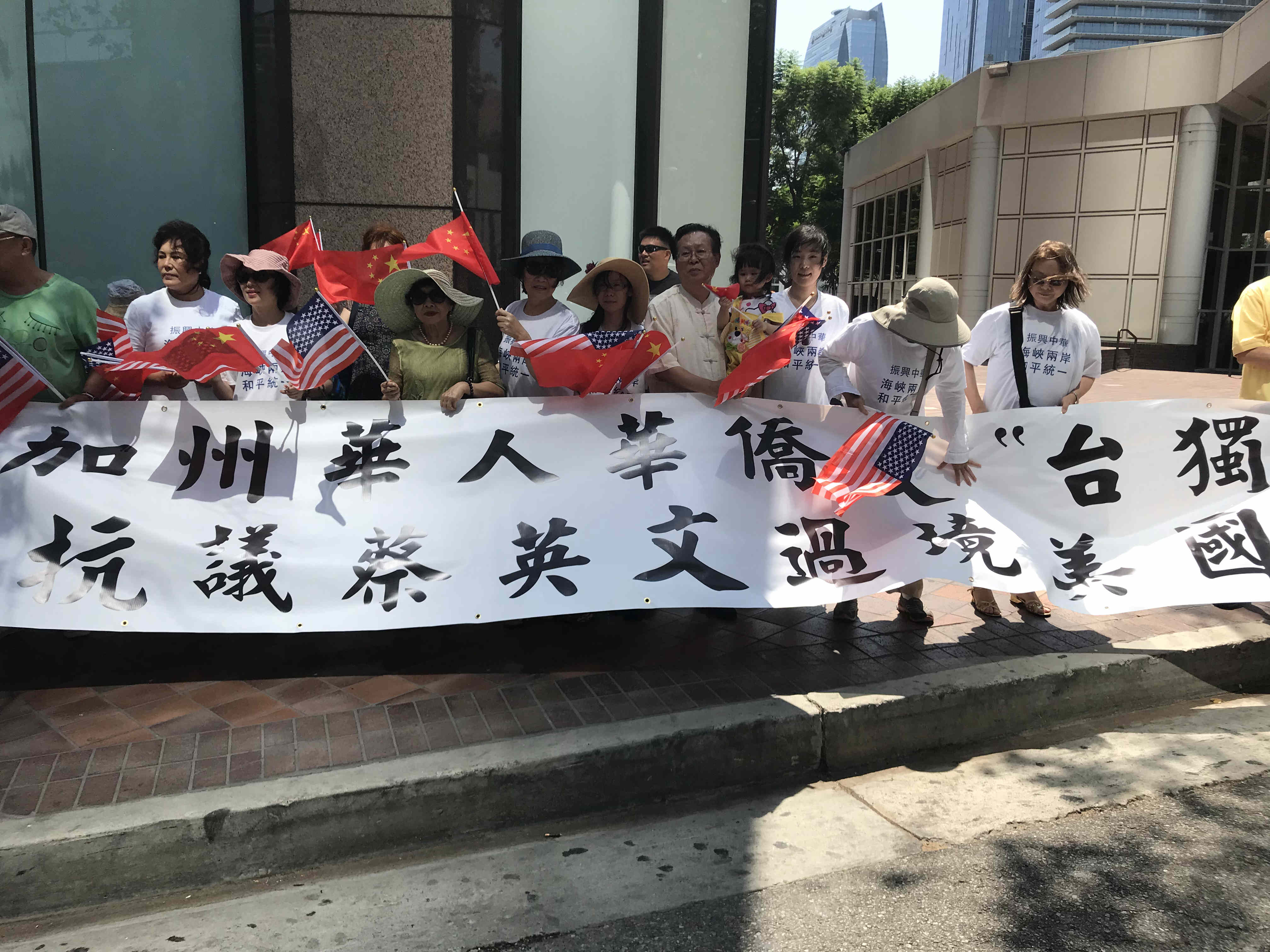 此前,据台媒报道,蔡英文即将“过境”洛杉矶,大陆驻当地领事馆动员中国和平统一促进会等团体,规划届时前往蔡英文下榻饭店外抗议,而国民党美西南支部等组织,也将配合进行突袭式抗议滋扰,形成“红蓝合作”的奇特景观。据报道,活动发起单位还将租用小飞机,在洛杉矶上空拉起“只有一个中国,台湾是中国的一部分,Only One China. Taiwan is part of China”的中英文横幅,抗议蔡英文“背离中华民国、不认同‘九二共识’”的罪状。
