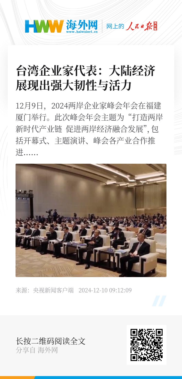 中共中央台办、国务院台办主任宋涛在福建厦门会见2024两岸企业家峰会年会与会台湾企业家代表。台湾企业家代表表示,大陆经济展现出强大韧性与活力,发展新质生产力前景光明。