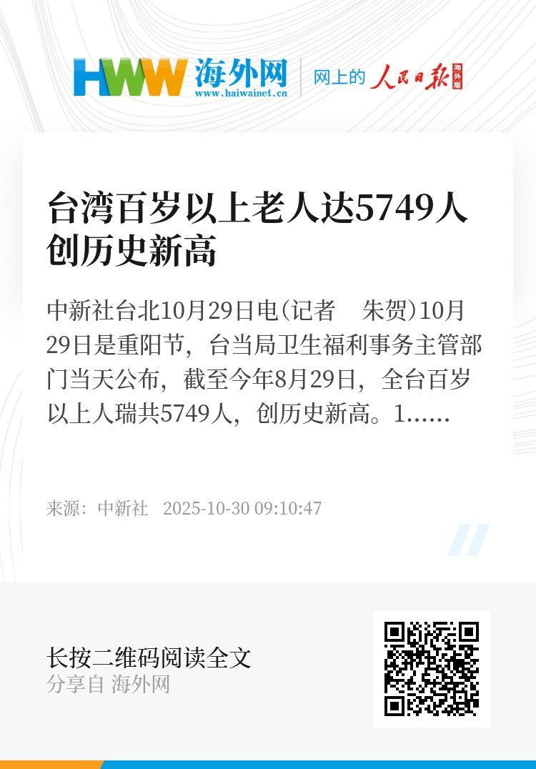 中新社台北10月29日电(记者 朱贺)10月29日是重阳节,台当局卫生福利事务主管部门当天公布,截至今年8月29日,全台百岁以上人瑞共5749人,创历史新高。