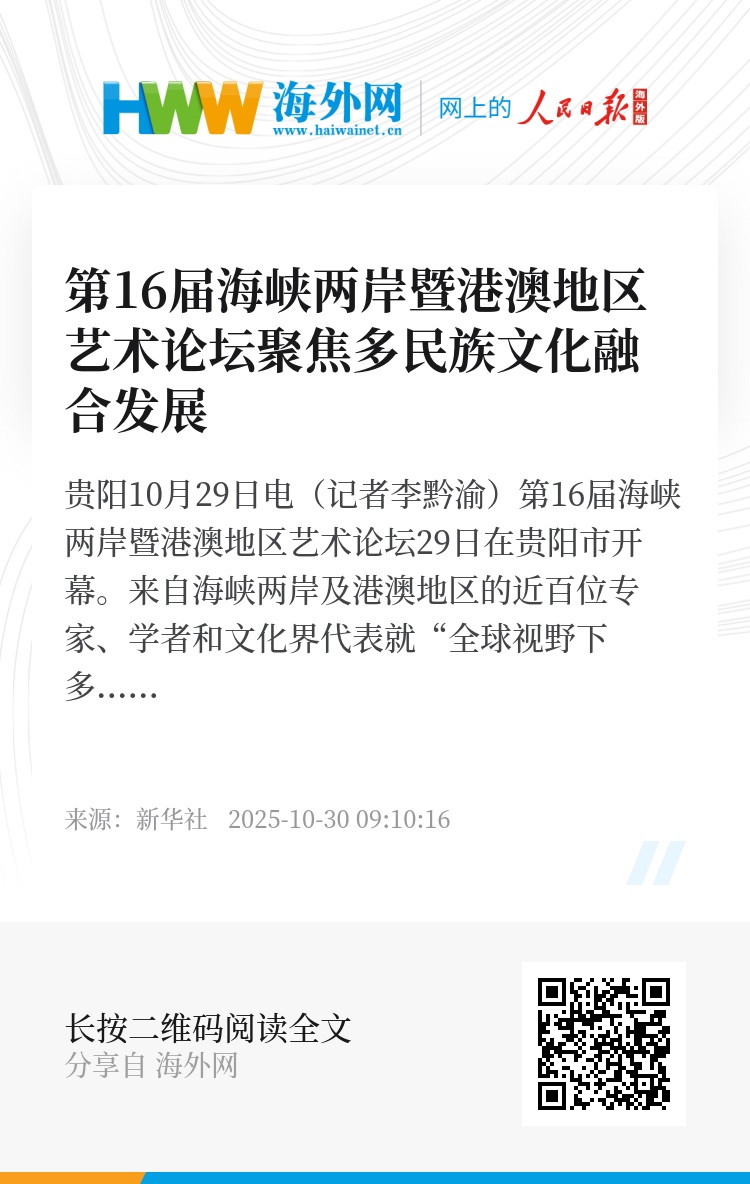 新华社贵阳10月29日电(记者李黔渝)第16届海峡两岸暨港澳地区艺术论坛29日在贵阳市开幕。来自海峡两岸及港澳地区的近百位专家、学者和文化界代表就“全球视野下多民族文化的融合发展与国际传播”主题展开对话。