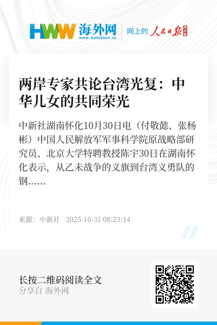 中新社湖南怀化10月30日电(付敬懿、张杨彬)中国人民解放军军事科学院原战略部研究员、北京大学特聘教授陈宇30日在湖南怀化表示,从乙未战争的义旗到台湾义勇队的钢枪,台湾光复的历史是一部全体中华儿女共御外侮的抗争史,更是一部中华民族走向复兴的团结史。