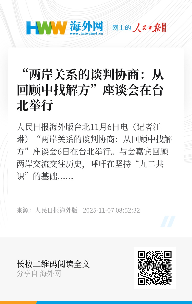 人民日报海外版台北11月6日电(记者江琳)“两岸关系的谈判协商:从回顾中找解方”座谈会6日在台北举行。与会嘉宾回顾两岸交流交往历史,呼吁在坚持“九二共识”的基础上增进两岸沟通对话、恢复两岸协商谈判。