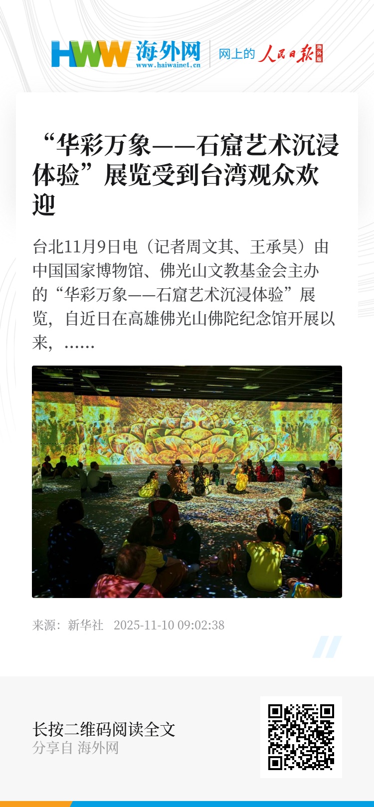 新华社台北11月9日电(记者周文其、王承昊)由中国国家博物馆、佛光山文教基金会主办的“华彩万象——石窟艺术沉浸体验”展览,自近日在高雄佛光山佛陀纪念馆开展以来,受到台湾观众欢迎。