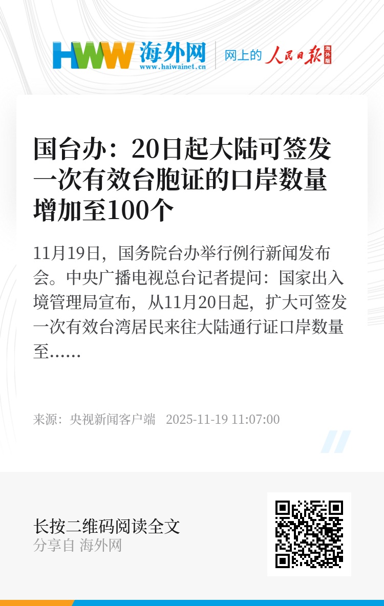 11月19日,国务院台办举行例行新闻发布会。中央广播电视总台记者提问:国家出入境管理局宣布,从11月20日起,扩大可签发一次有效台湾居民来往大陆通行证口岸数量至100个。请问现在准备工作如何?