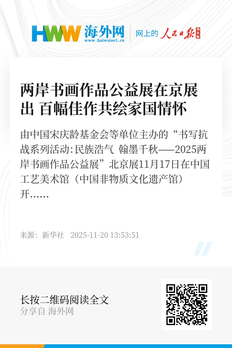 由中国宋庆龄基金会等单位主办的“书写抗战系列活动:民族浩气 翰墨千秋——2025两岸书画作品公益展”北京展11月17日在中国工艺美术馆(中国非物质文化遗产馆)开幕。展览将持续至12月7日。