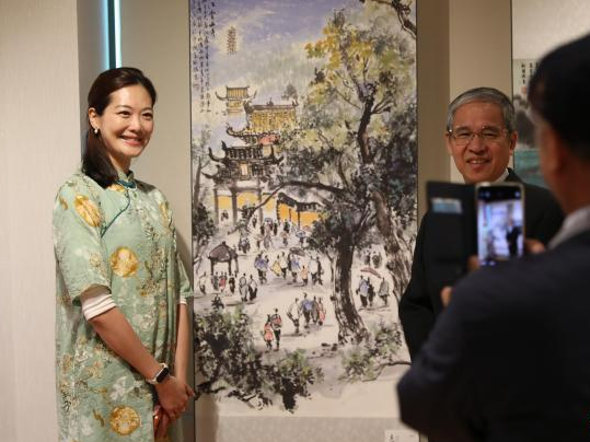 中新社记者在现场看到,展出作品题材既有运河畔的市井美食、水乡烟火,也有奇石云雾、古寺园林。这些作品源于江苏与台湾艺术家今夏在无锡、镇江等地的采风见闻。