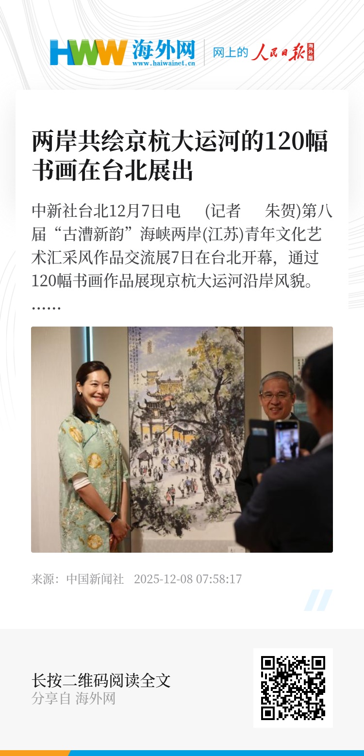中新社台北12月7日电 (记者 朱贺)第八届“古漕新韵”海峡两岸(江苏)青年文化艺术汇采风作品交流展7日在台北开幕,通过120幅书画作品展现京杭大运河沿岸风貌。