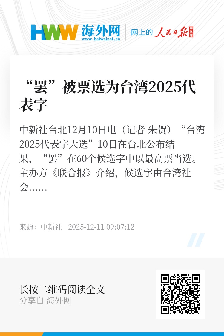 中新社台北12月10日电(记者 朱贺)“台湾2025代表字大选”10日在台北公布结果,“罢”在60个候选字中以最高票当选。
