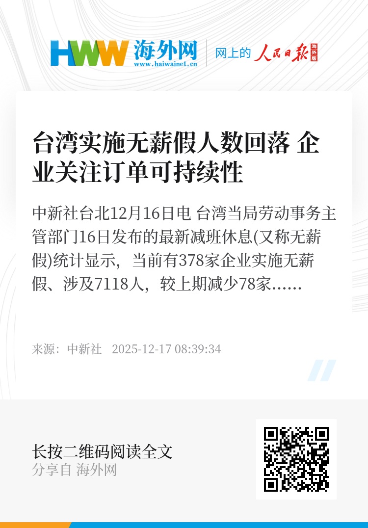 中新社台北12月16日电 台湾当局劳动事务主管部门16日发布的最新减班休息(又称无薪假)统计显示,当前有378家企业实施无薪假、涉及7118人,较上期减少78家,人数减少2035人。