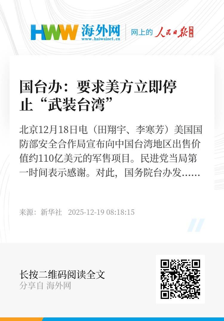 新华社北京12月18日电(田翔宇、李寒芳)美国国防部安全合作局宣布向中国台湾地区出售价值约110亿美元的军售项目。民进党当局第一时间表示感谢。对此,国务院台办发言人陈斌华18日应询表示,台湾问题是中国核心利益中的核心,是中美关系第一条不可逾越的红线。美方悍然宣布向中国台湾地区出售巨额武器计划,粗暴干涉中国内政,严重违反一个中国原则和中美三个联合公报特别是“八·一七”公报规定,严重损害中国主权和安全利益,向“台独”分裂势力发出严重错误信号,我们对此坚决反对,严正谴责。要求美方立即停止“武装台湾”,停止纵容支持“台独”分裂势力,恪守一个中国原则和中美三个联合公报,落实美国领导人所作承诺,慎之又慎处理台湾问题。