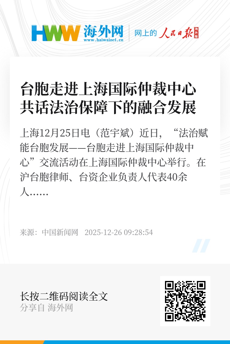 中新网上海12月25日电(范宇斌)近日,“法治赋能台胞发展——台胞走进上海国际仲裁中心”交流活动在上海国际仲裁中心举行。在沪台胞律师、台资企业负责人代表40余人参加活动。