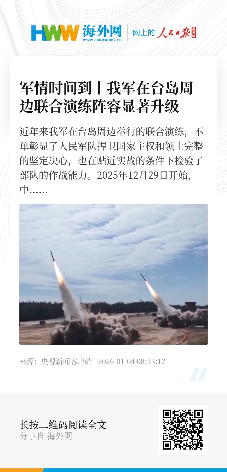 2025年12月29日开始,中国人民解放军东部战区组织陆、海、空和火箭军等兵力,位于台湾海峡、台岛北部、西南、东南和台岛以东,组织“正义使命-2025”演习,重点演练海空战备警巡、夺取综合制权、要港要域封控、外线立体慑阻等科目,舰机多向抵近台岛,诸军兵种联合突击,旨在检验战区部队联合作战实战能力。
