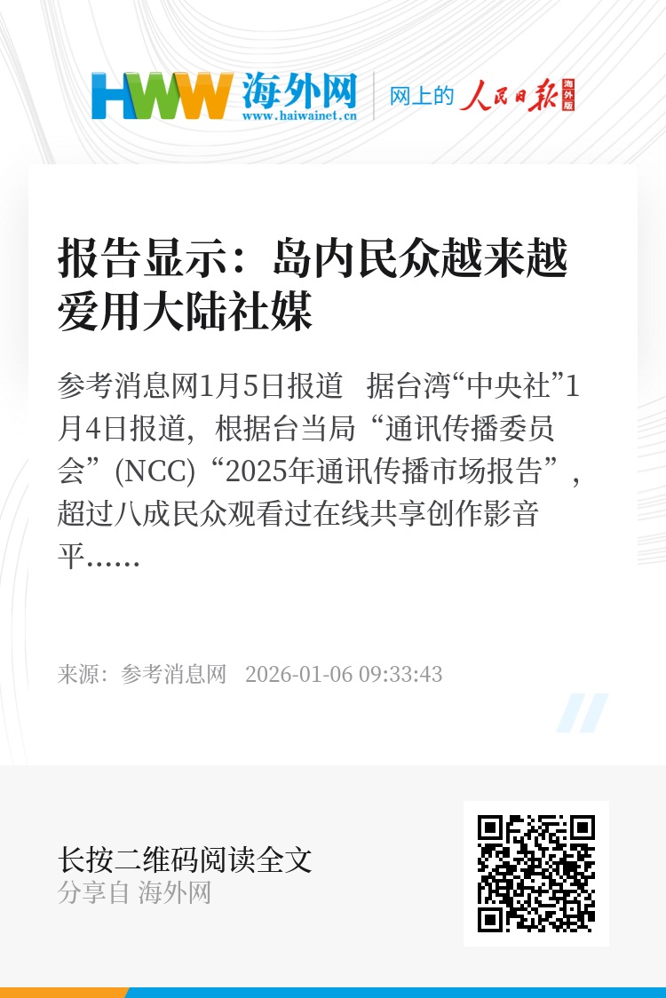 参考消息网1月5日报道 据台湾“中央社”1月4日报道,根据台当局“通讯传播委员会”(NCC)“2025年通讯传播市场报告”,超过八成民众观看过在线共享创作影音平台内容,其中观看抖音(TikTok)的比例逐年上升,2025年已达47.5%,在各年龄层中,16至25岁族群增长幅度最大,从2019年的24%大幅升至2025年的72.5%。