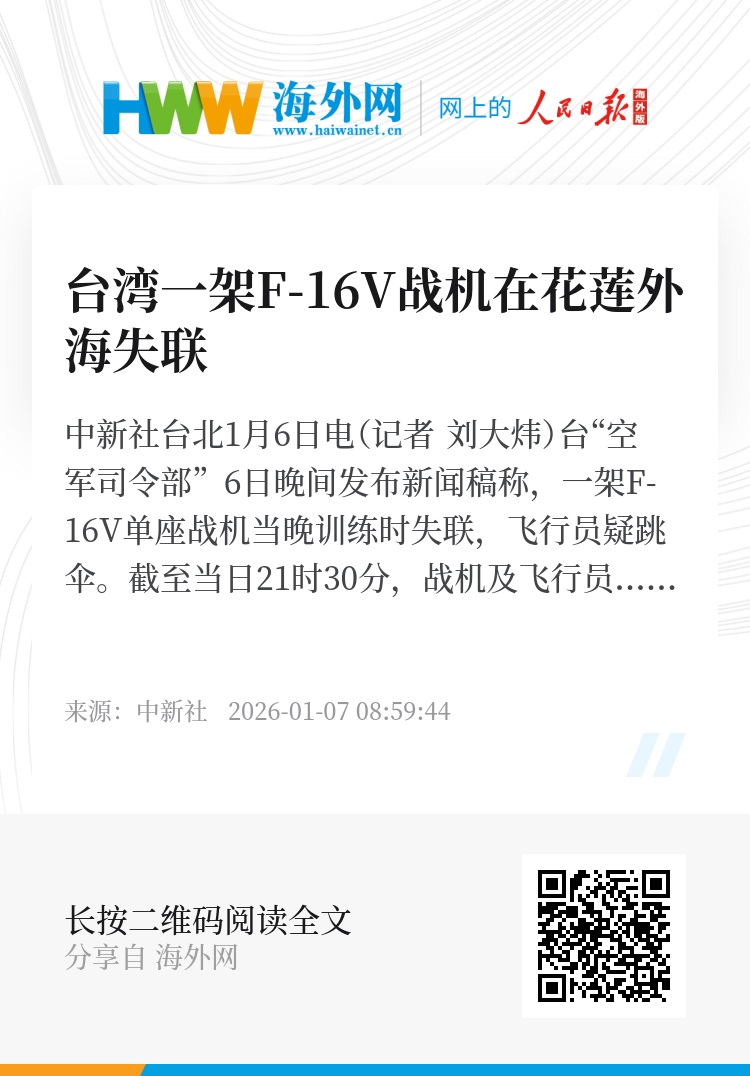 中新社台北1月6日电(记者 刘大炜)台“空军司令部”6日晚间发布新闻稿称,一架F-16V单座战机当晚训练时失联,飞行员疑跳伞。截至当日21时30分,战机及飞行员仍然失联,搜救工作正在进行中。