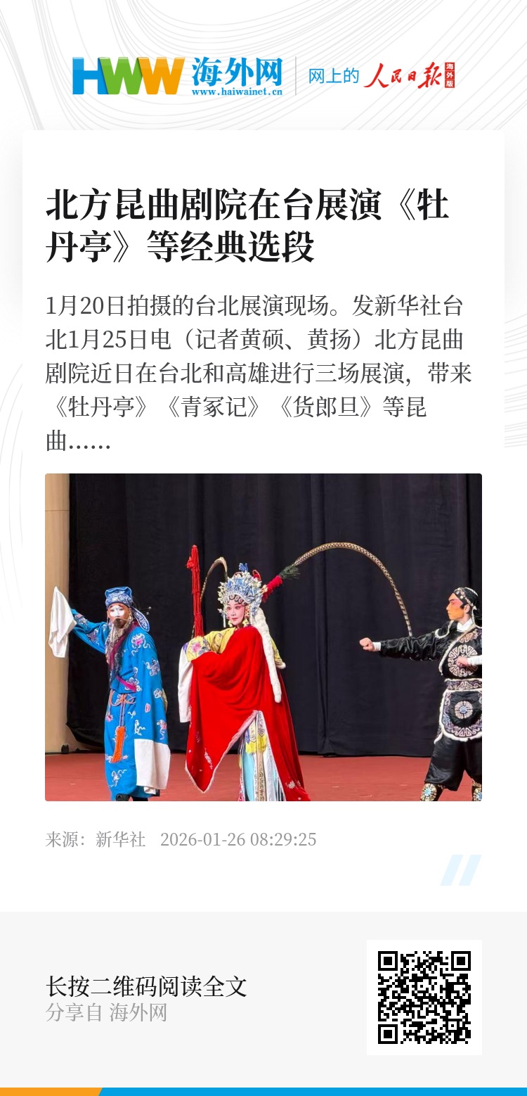 新华社台北1月25日电(记者黄硕、黄扬)北方昆曲剧院近日在台北和高雄进行三场展演,带来《牡丹亭》《青冢记》《货郎旦》等昆曲作品中的经典选段,让观众近距离感受昆曲艺术魅力。