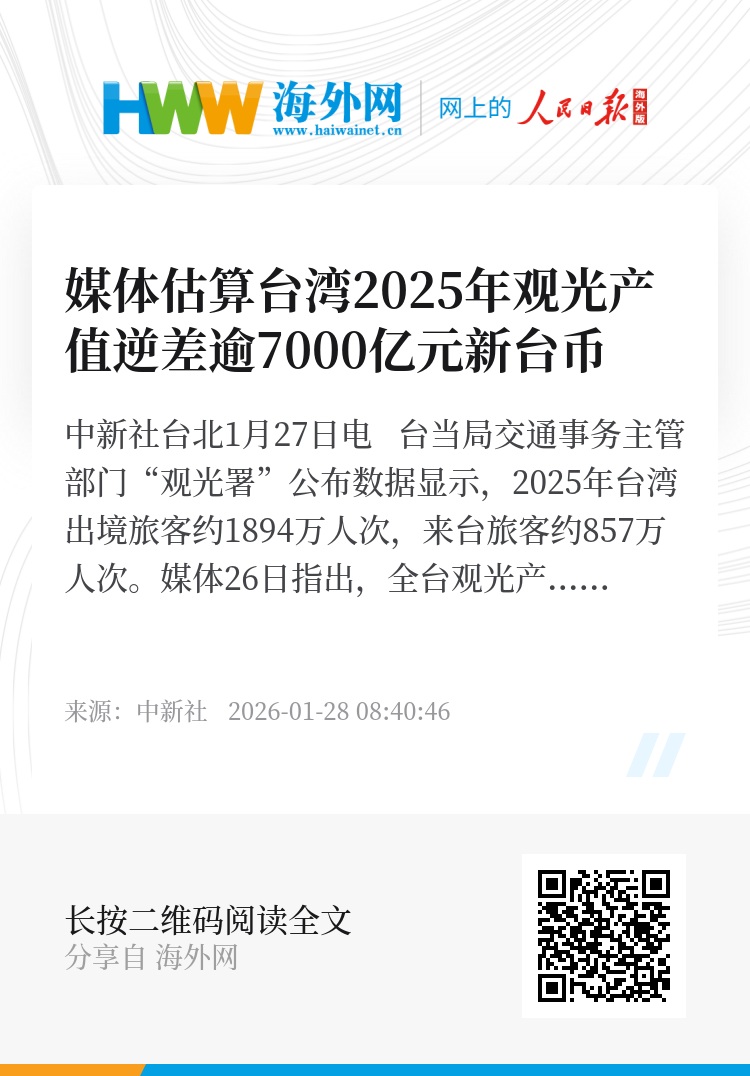 综合中央社、联合新闻网和中时新闻网等台媒报道,“观光署”数据显示,2025年台湾出境、入境旅客数量相差近1037万人次;参照2024年消费数据,推估2025年观光产值逆差约为7010亿元。
