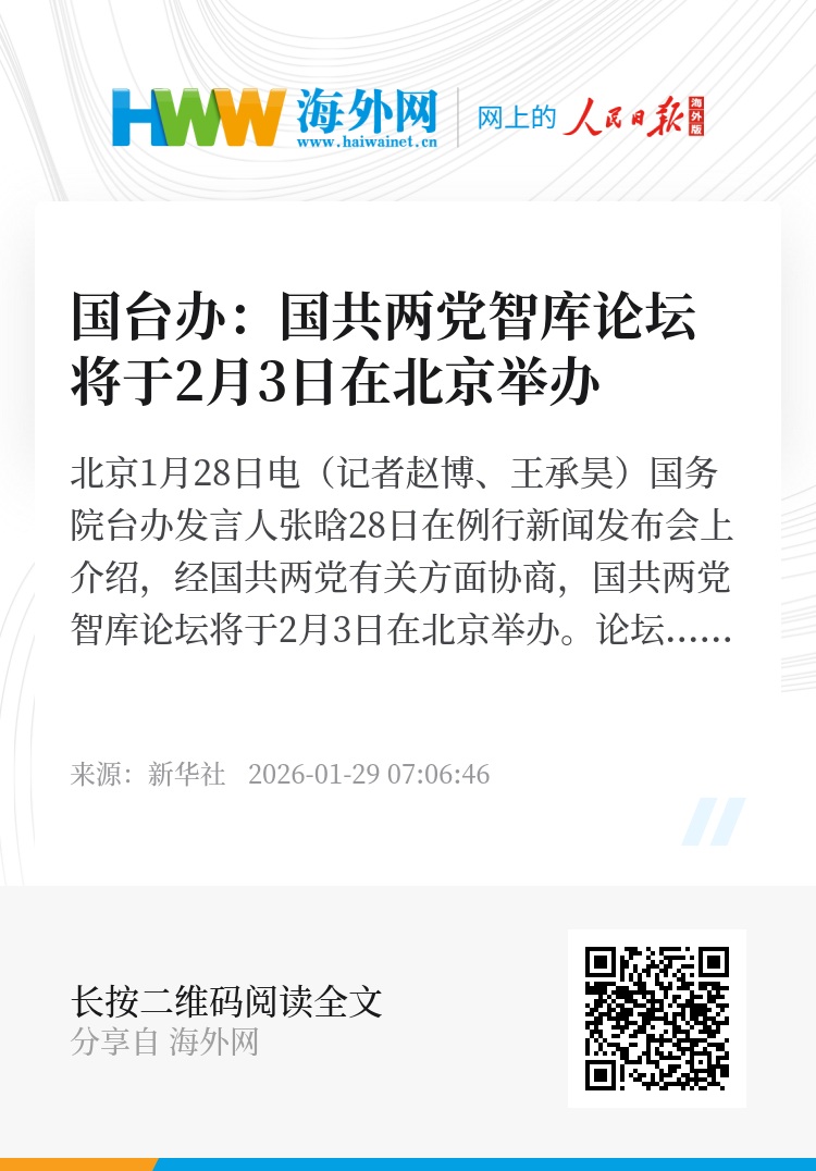 新华社北京1月28日电(记者赵博、王承昊)国务院台办发言人张晗28日在例行新闻发布会上介绍,经国共两党有关方面协商,国共两党智库论坛将于2月3日在北京举办。论坛由中共中央台办海研中心与中国国民党国政研究基金会共同主办。本届论坛主题为“两岸交流合作前瞻”,国共两党及两岸旅游、工业、科技、医疗、环保等界别代表人士、专家学者将出席论坛,围绕两岸旅游、产业、环境与永续发展交流合作等议题深入交流研讨,共商两岸关系发展大计,共谋两岸同胞利益福祉。