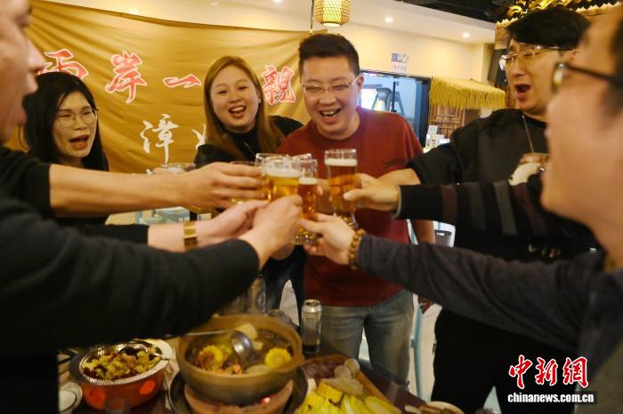 2月12日晚,台湾夫妻张仲隆和杨筱荞在福建漳州古城“澎湖湾”餐饮店,邀请了几位大陆青年朋友一起吃团圆饭,共同举杯喜迎马年春节。中新网记者 张金川 摄