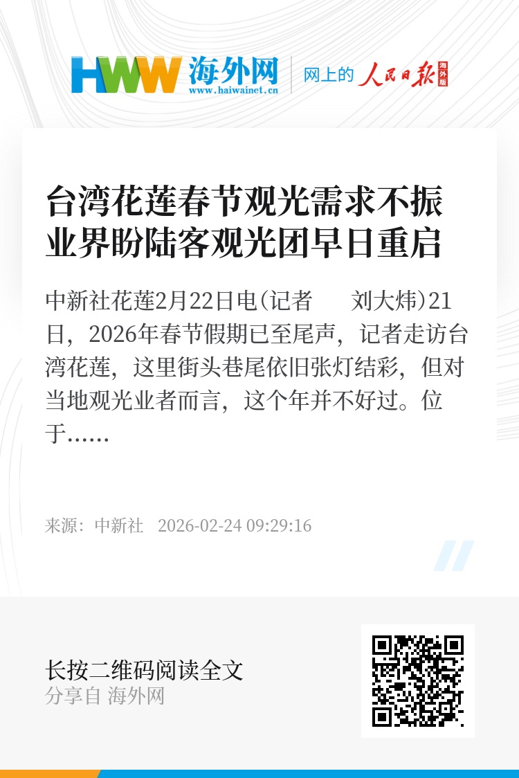 中新社花莲2月22日电(记者 刘大炜)21日,2026年春节假期已至尾声,记者走访台湾花莲,这里街头巷尾依旧张灯结彩,但对当地观光业者而言,这个年并不好过。