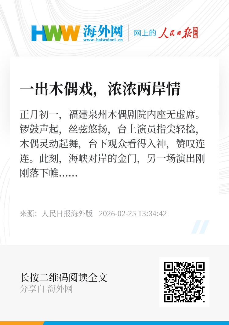 今年正月初四起,来自台湾的木偶戏团还将走进竹初木偶艺术馆,献上“闹新春”等剧目。“常交流、多携手,老技艺才能代代相传,两岸同胞的心也会越走越近。”徐强说,看着两岸艺人同台献艺、民众共赏好戏,便是新春里最暖的团圆。(新华社福州电 记者吴剑锋、杜雅宁)