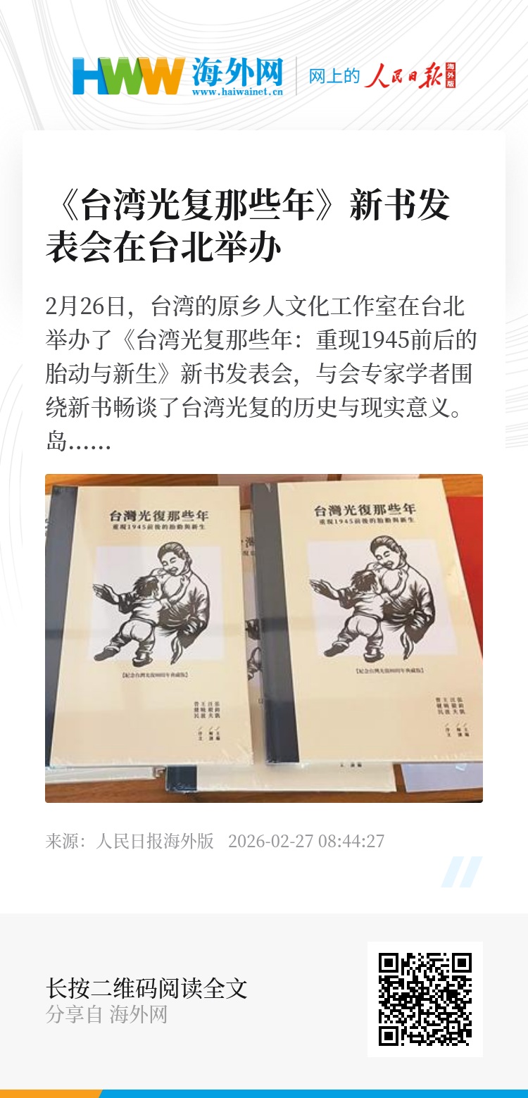 2月26日,台湾的原乡人文化工作室在台北举办了《台湾光复那些年:重现1945前后的胎动与新生》新书发表会,与会专家学者围绕新书畅谈了台湾光复的历史与现实意义。岛内资深媒体人、原乡人文化工作室执行长张钧凯表示,出版本书的目的在于回到历史现场,破除“台独”史观,看清历史和未来。图为《台湾光复那些年:重现1945前后的胎动与新生》一书。