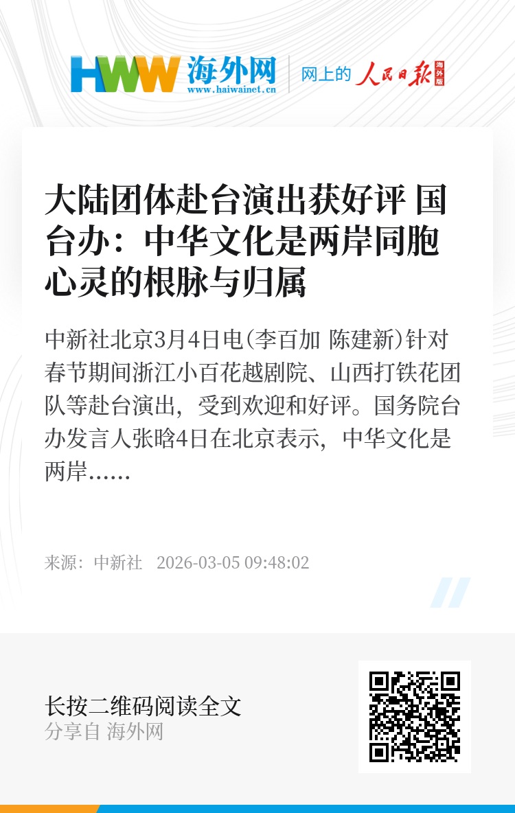 张晗表示,春节期间,浙江小百花越剧院携《我的大观园》与《爱情的花园》双剧赴台演出,山西高平非遗项目打铁花赴台表演,受到岛内观众特别是青年观众的喜爱和好评,彰显了中华优秀传统文化的独特魅力和强烈感染力。台湾同胞对中华文化的热爱和认同,再次印证了两岸同胞同根同源、同文同种。岛内有关人士的呼吁更道出了两岸同胞要和平、要发展、要交流、要合作的共同心声。