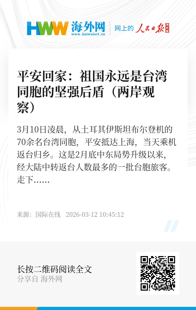 台湾同胞是中国公民,是大陆的骨肉乡亲。从利比亚、也门、苏丹撤侨,到巴以冲突爆发,到这次滞留中东的台胞平安归来,大陆都与当地台胞保持紧密联系,及时提供协助。无论在什么地方,遇到什么困难,伟大祖国都是广大台湾同胞的坚强后盾。(作者:常滨)