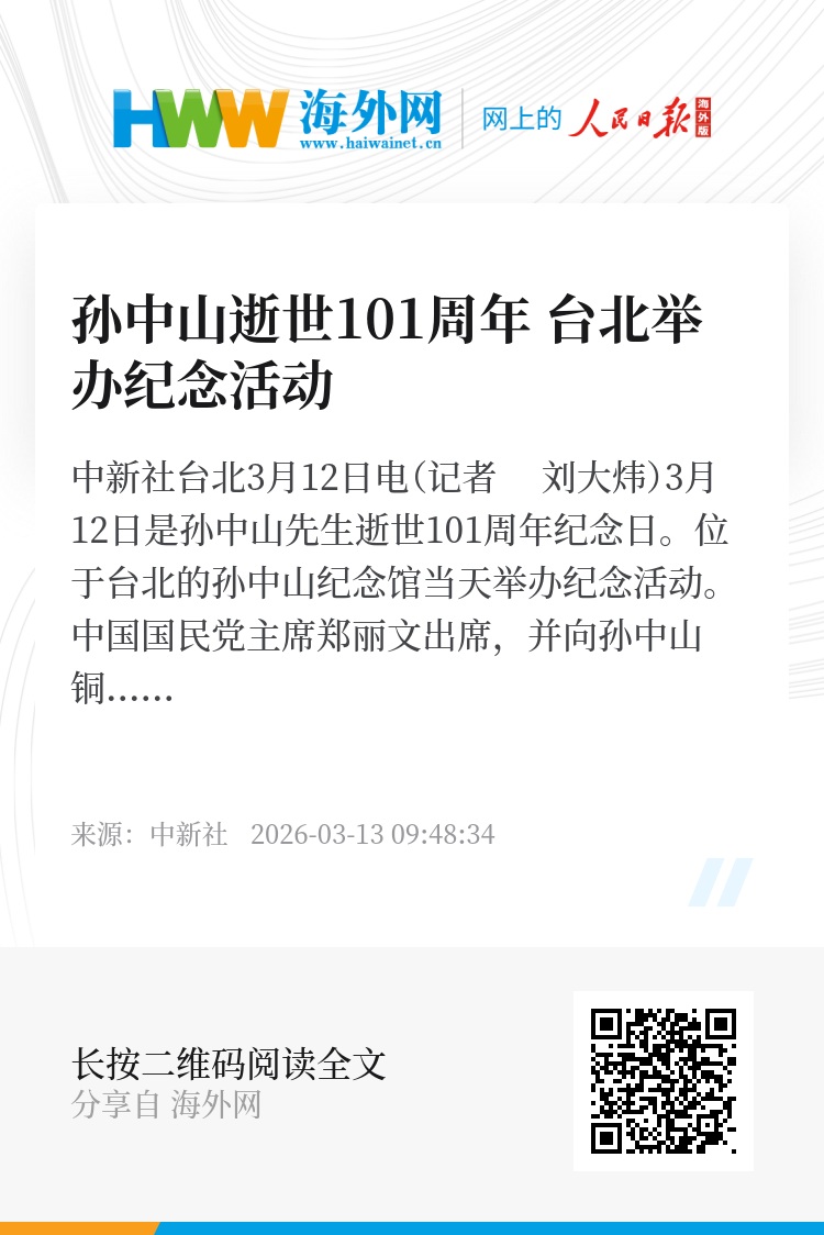 中新社台北3月12日电(记者 刘大炜)3月12日是孙中山先生逝世101周年纪念日。位于台北的孙中山纪念馆当天举办纪念活动。中国国民党主席郑丽文出席,并向孙中山铜像献花。
