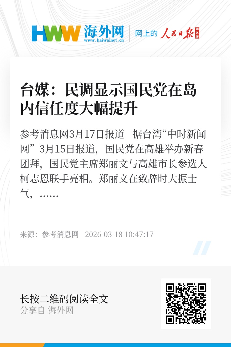 参考消息网3月17日报道 据台湾“中时新闻网”3月15日报道,国民党在高雄举办新春团拜,国民党主席郑丽文与高雄市长参选人柯志恩联手亮相。郑丽文在致辞时大振士气,引用媒体最新民调指出国民党信任度已大幅提升至43%,与民进党呈现“黄金交叉”,并首度在南台湾详述与民众党主席黄国昌共同推动的“台湾未来账户”政策。柯志恩则抛出施政框架,表示要在12月25日入主市政府宣誓就职,带动高雄大翻转。