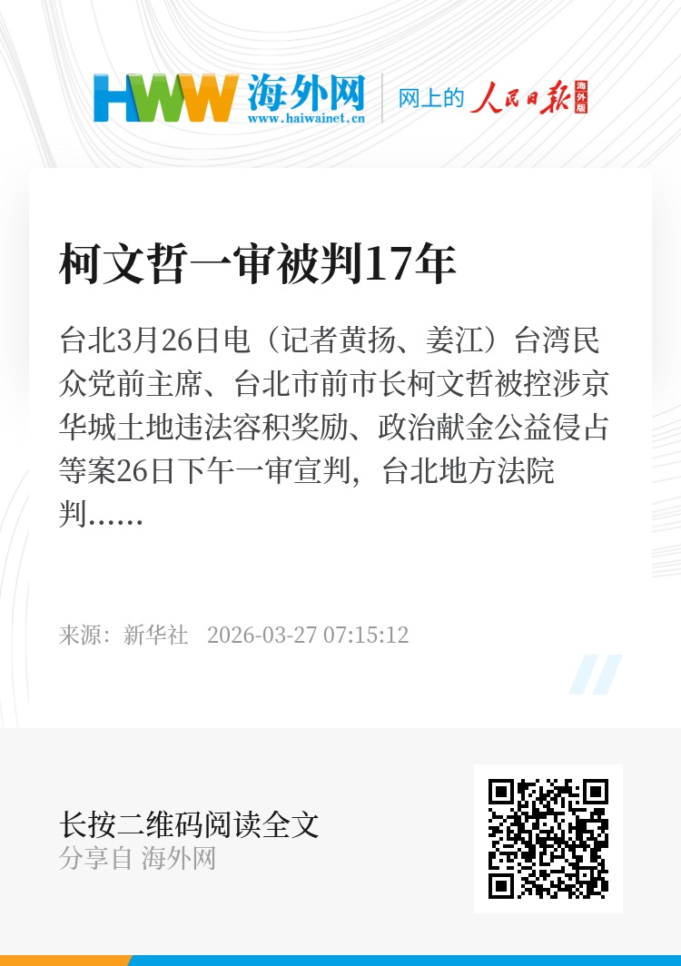 新华社台北3月26日电(记者黄扬、姜江)台湾民众党前主席、台北市前市长柯文哲被控涉京华城土地违法容积奖励、政治献金公益侵占等案26日下午一审宣判,台北地方法院判处柯文哲有期徒刑17年、剥夺公权6年,可上诉。