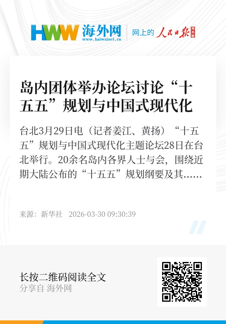 新华社台北3月29日电(记者姜江、黄扬)“十五五”规划与中国式现代化主题论坛28日在台北举行。20余名岛内各界人士与会,围绕近期大陆公布的“十五五”规划纲要及其与中国式现代化的关系进行讨论交流。