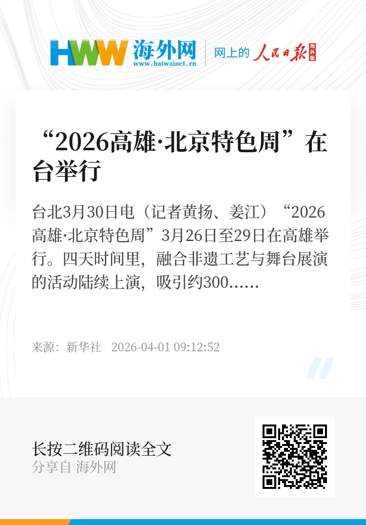 新华社台北3月30日电(记者黄扬、姜江)“2026高雄·北京特色周”3月26日至29日在高雄举行。四天时间里,融合非遗工艺与舞台展演的活动陆续上演,吸引约3000名台湾民众参与。
