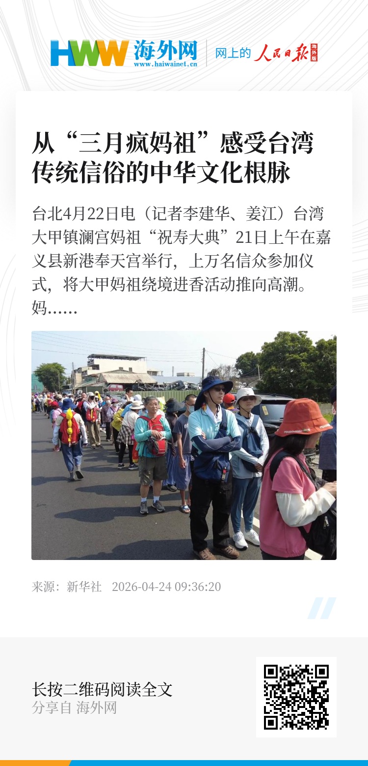 今年大甲妈祖绕境进香活动于17日晚“起驾”,共持续9天8夜,跨越台中、彰化、云林、嘉义4县市近百座庙宇,全程300多公里,预计26日回銮安座。连日来,记者跟随进香队伍,亲身体验台湾这一传统信俗背后的中华文化基因。